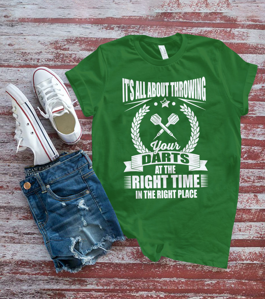 The It's All About Throwing Your Darts at the Right Time in the Right Place Shirt offers a regular fit. Made from 100% ring-spun cotton that is pre-shrunk to help maintain size and shape after washing. Features reinforced construction details for durability. Available in U.S. standard sizes S-5XL to accommodate various body types.
