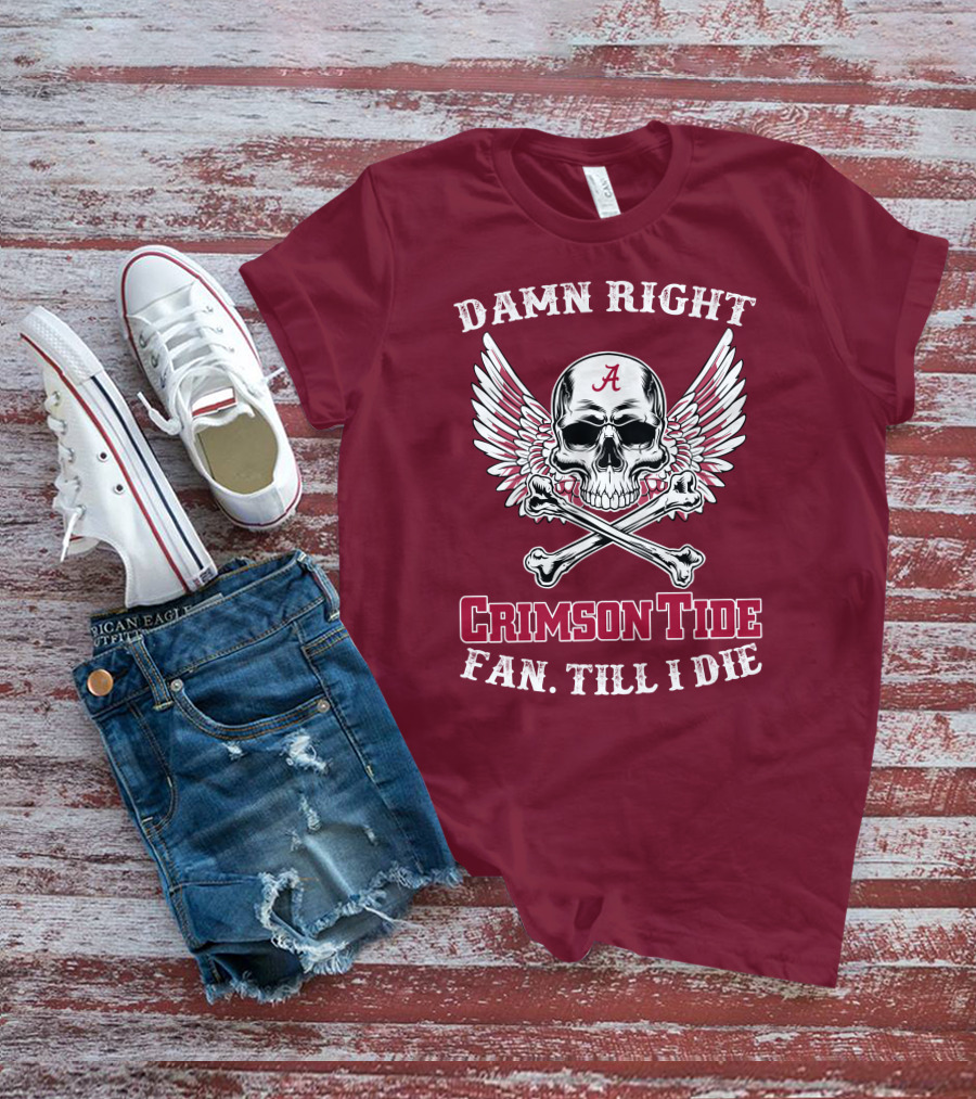 Damn Right Crimson Tide Fan Till I Die Winged Skull With Crossbones T-Shirt