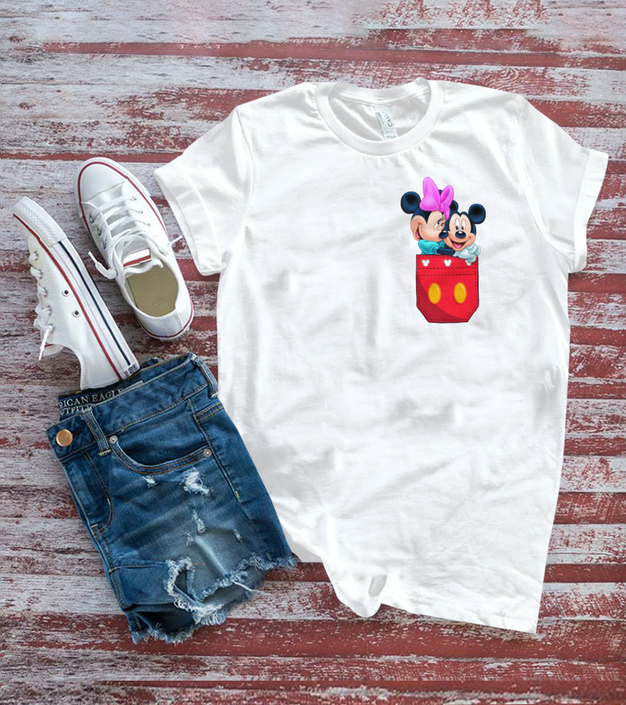 Mickey Mouse And Minnie Mouse In Red Pocket With Hearts And Bow T-Shirt