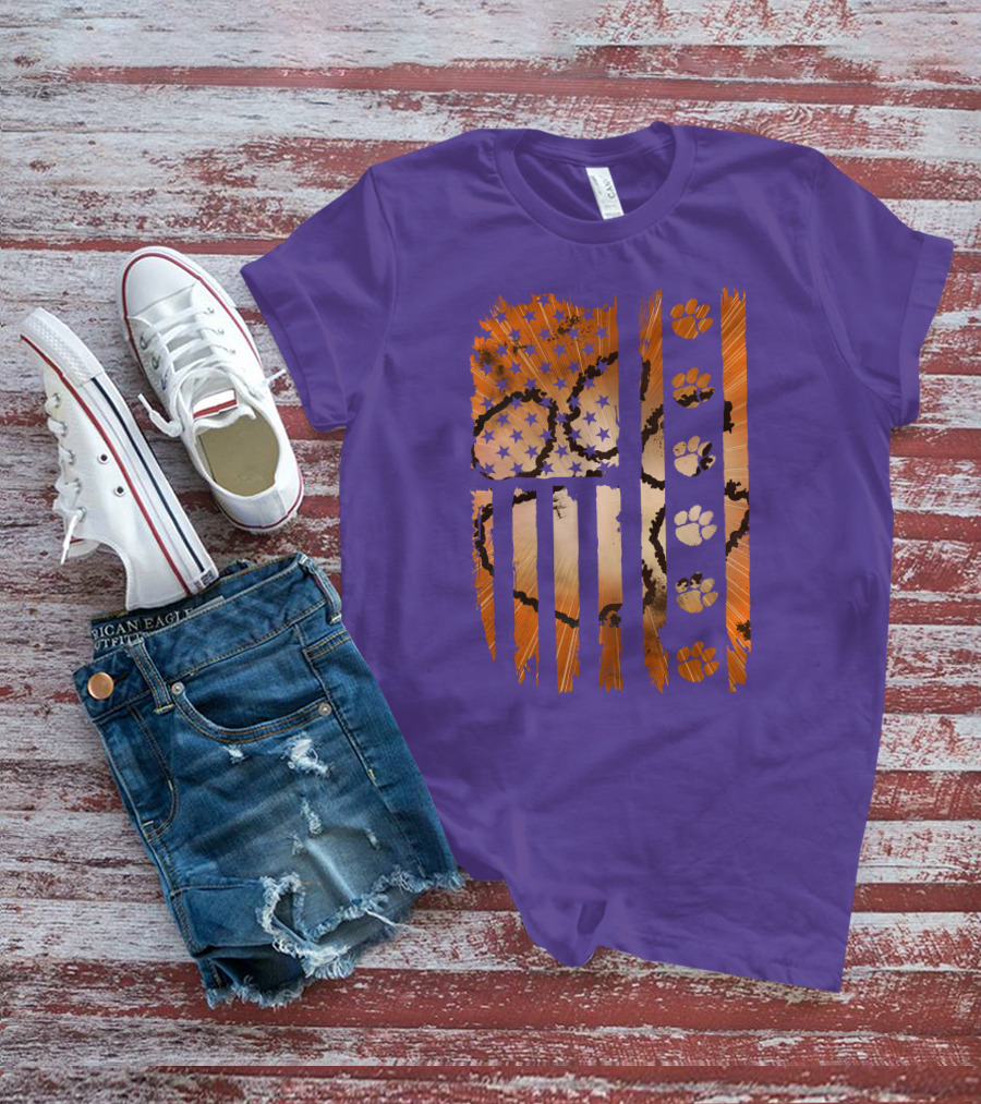 The Clemson Tigers Paw Print American Flag Shirt offers a regular fit. Made from 100% ring-spun cotton that is pre-shrunk to help maintain size and shape after washing. Features reinforced construction details for durability. Available in U.S. standard sizes S-5XL to accommodate various body types.