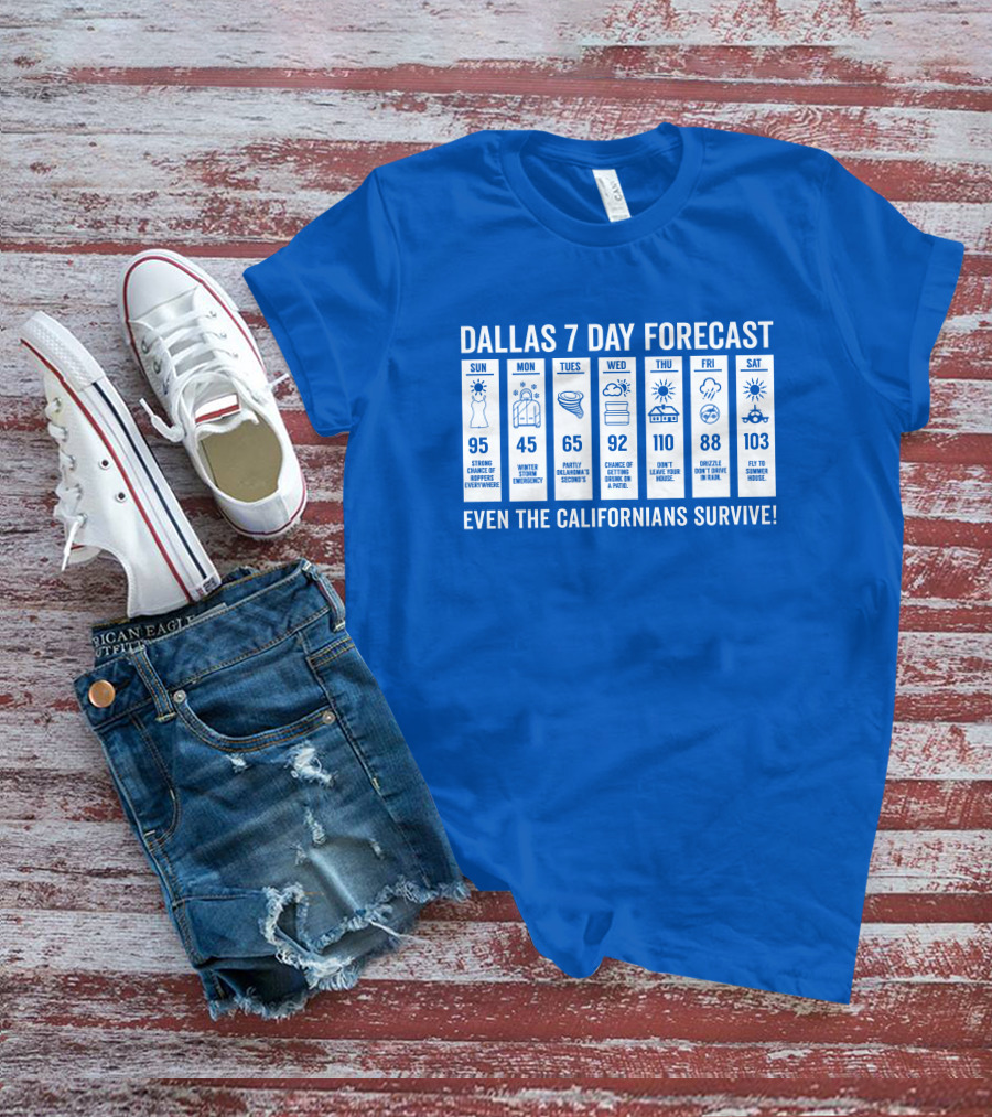 The Dallas 7 Day Forecast Weather Parody Even the Californians Survive Bullzerk Merch Shirt offers a regular fit. Made from 100% ring-spun cotton that is pre-shrunk to help maintain size and shape after washing. Features reinforced construction details for durability. Available in U.S. standard sizes S-5XL to accommodate various body types.