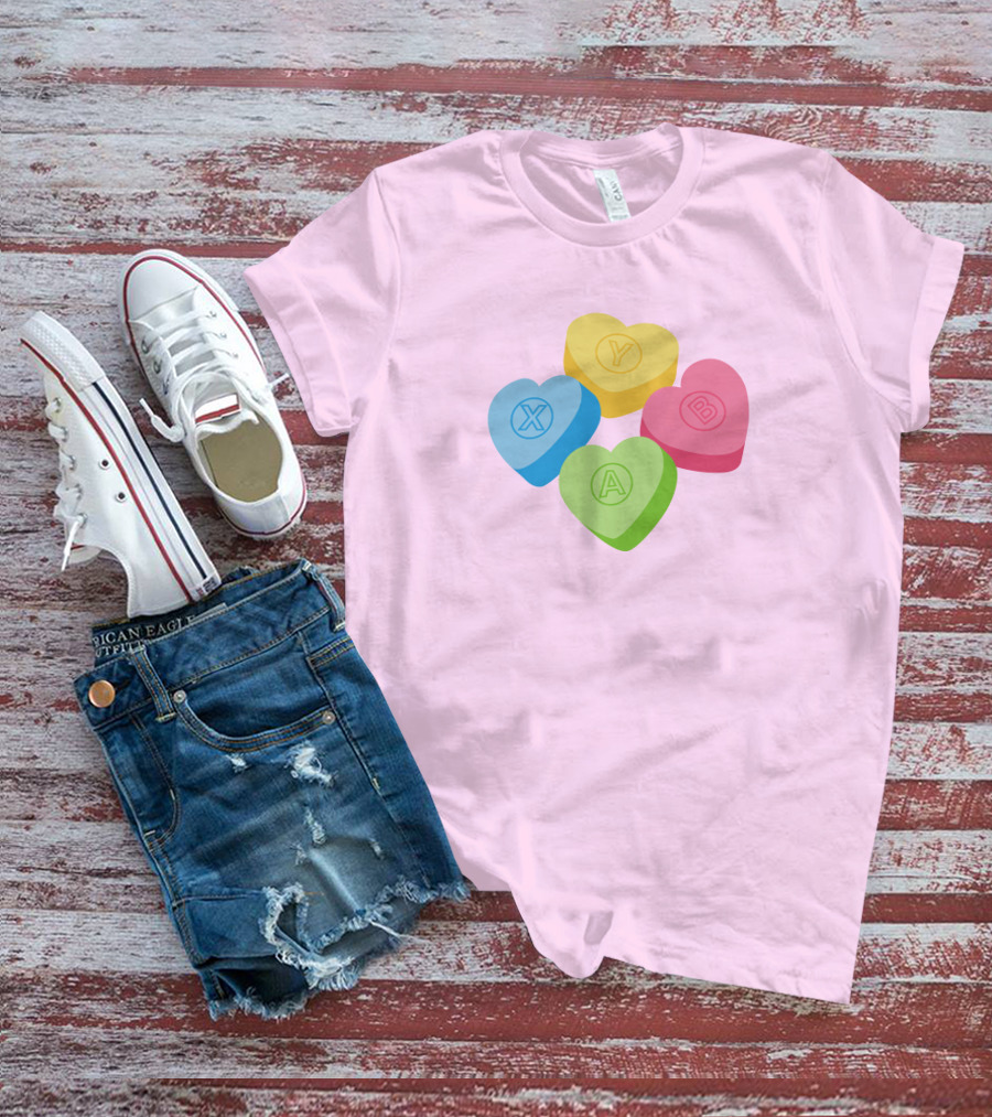 The Valentine's Candy Hearts X Y A B Shirt offers a regular fit. Made from 100% ring-spun cotton that is pre-shrunk to help maintain size and shape after washing. Features reinforced construction details for durability. Available in U.S. standard sizes S-5XL to accommodate various body types.