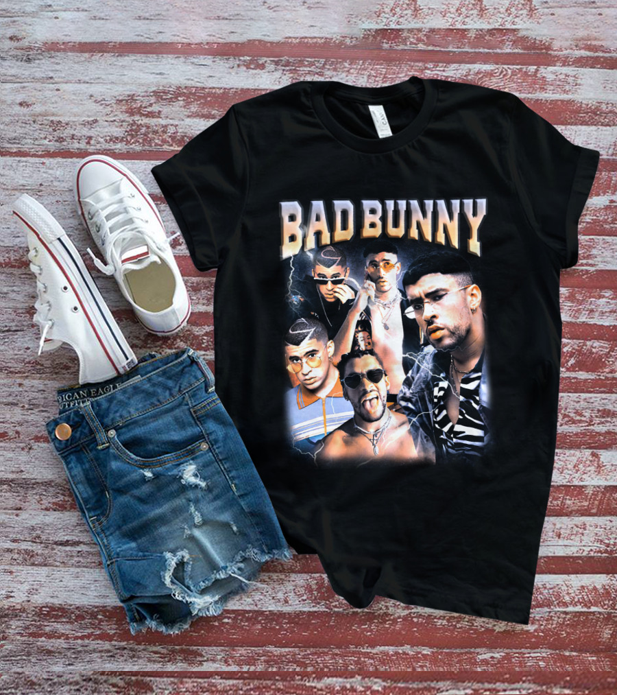 The Bad Bunny Style Evolution Lightning Collage Shirt offers a regular fit. Made from 100% ring-spun cotton that is pre-shrunk to help maintain size and shape after washing. Features reinforced construction details for durability. Available in U.S. standard sizes S-5XL to accommodate various body types.