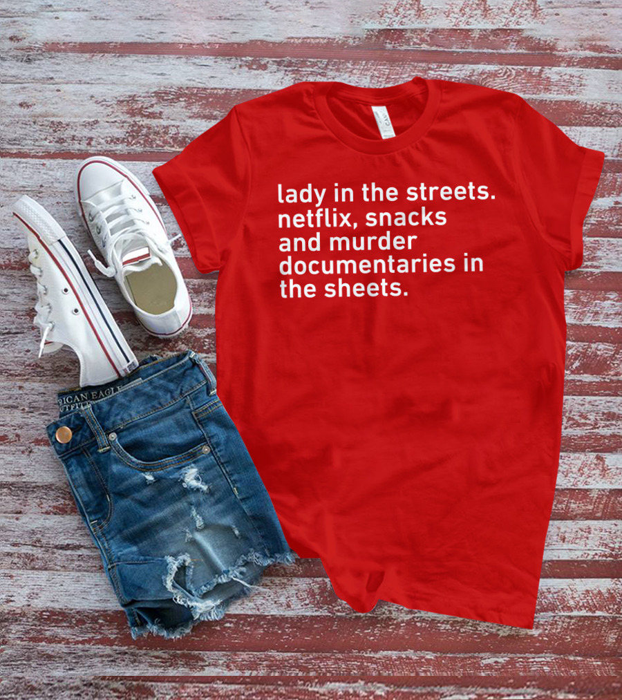 The Lady In The Streets Netflix Snacks And Murder Documentaries In The Sheets Classics Shirt offers a regular fit. Made from 100% ring-spun cotton that is pre-shrunk to help maintain size and shape after washing. Features reinforced construction details for durability. Available in U.S. standard sizes S-5XL to accommodate various body types.