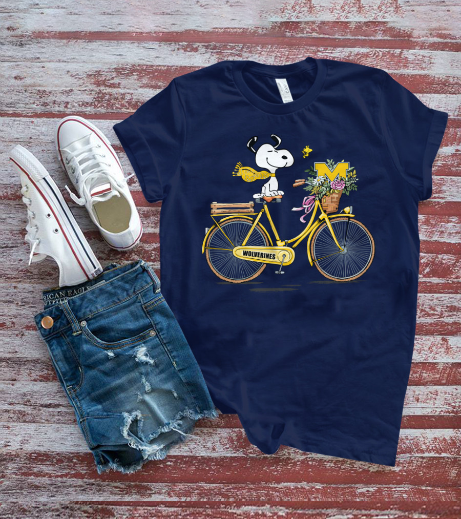 Michigan Wolverines Snoopy On Yellow Bicycle With Flowers T-Shirt