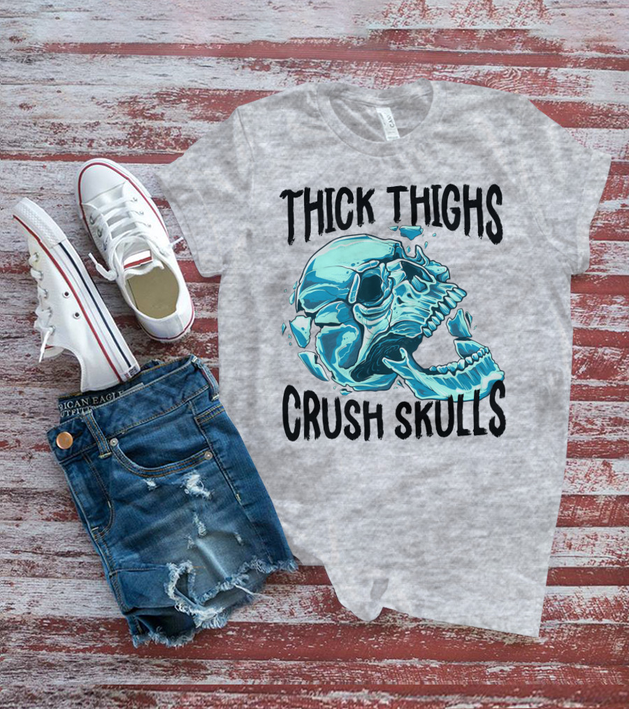 The Thick Thighs Crush Skulls Shirt offers a regular fit. Made from 100% ring-spun cotton that is pre-shrunk to help maintain size and shape after washing. Features reinforced construction details for durability. Available in U.S. standard sizes S-5XL to accommodate various body types.