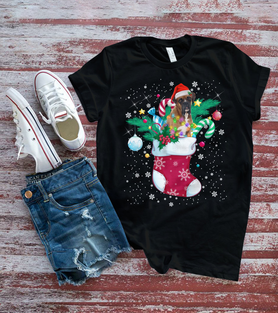 Boxer Dog In Santa Hat With Candy Canes In Christmas Stocking T-Shirt