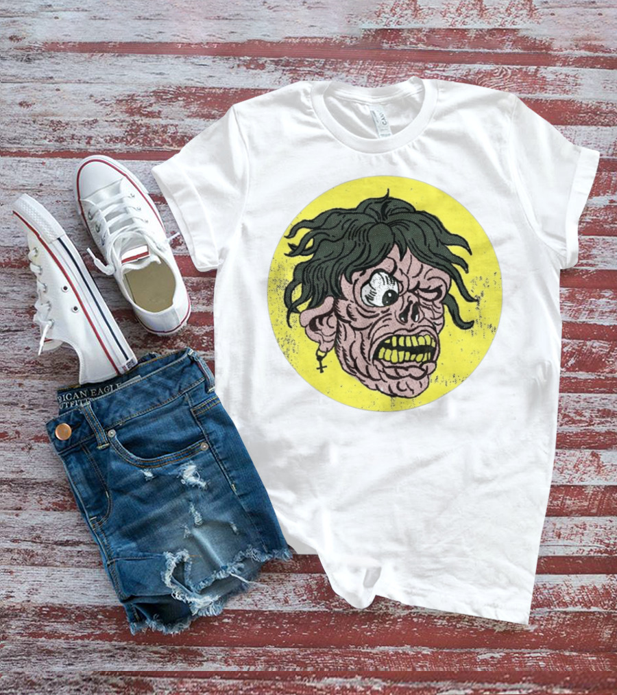 Rebel Zombie Grinning Undead Head With Cross Earring On Yellow Circle T-Shirt