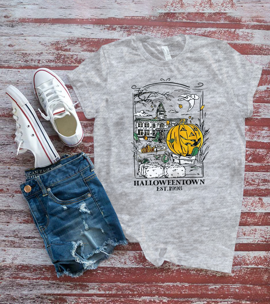 The Halloweentown Est 1998 Jack-O'-Lantern and Haunted House Scene Shirt offers a regular fit. Made from 100% ring-spun cotton that is pre-shrunk to help maintain size and shape after washing. Features reinforced construction details for durability. Available in U.S. standard sizes S-5XL to accommodate various body types.