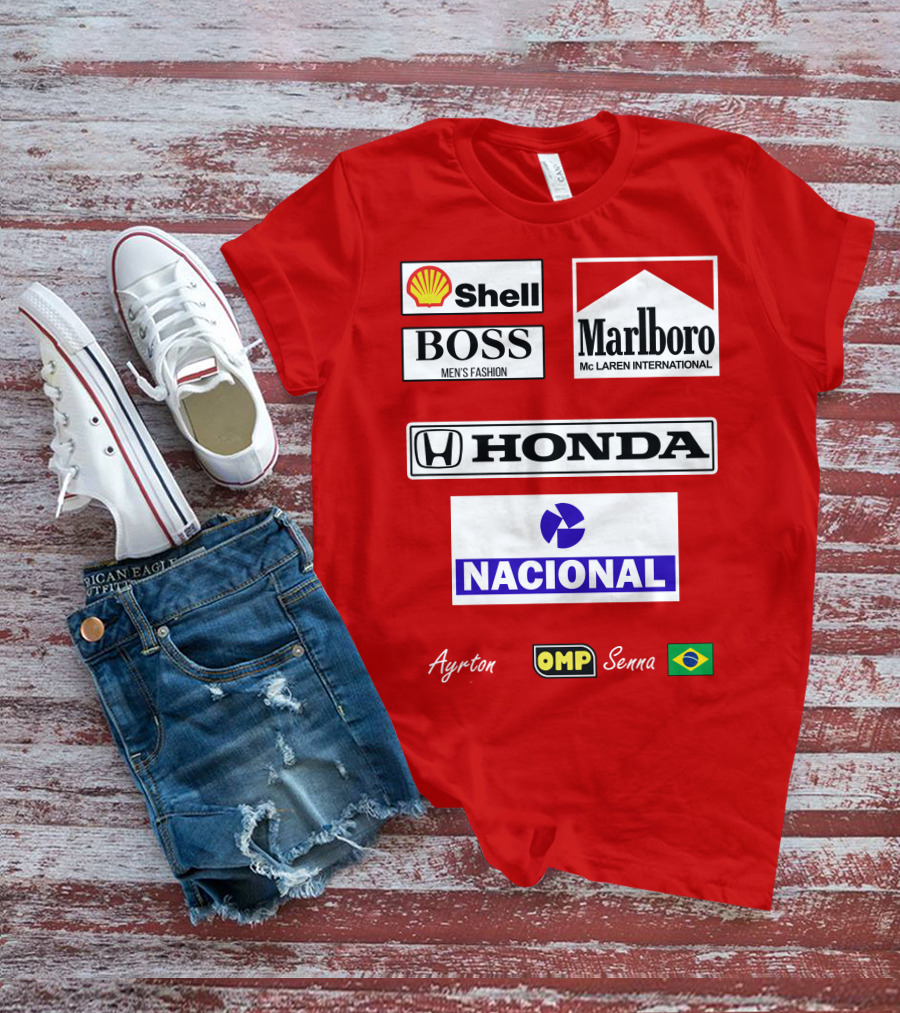 The Shell Boss Marlboro McLaren Honda Nacional Ayrton Senna OMP Brazil Flag Shirt offers a regular fit. Made from 100% ring-spun cotton that is pre-shrunk to help maintain size and shape after washing. Features reinforced construction details for durability. Available in U.S. standard sizes S-5XL to accommodate various body types.