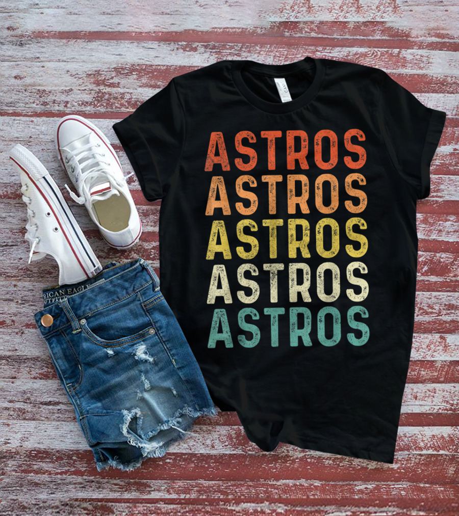 The Astros Retro Multicolor Vintage Style Repeated Text Shirt offers a regular fit. Made from 100% ring-spun cotton that is pre-shrunk to help maintain size and shape after washing. Features reinforced construction details for durability. Available in U.S. standard sizes S-5XL to accommodate various body types.