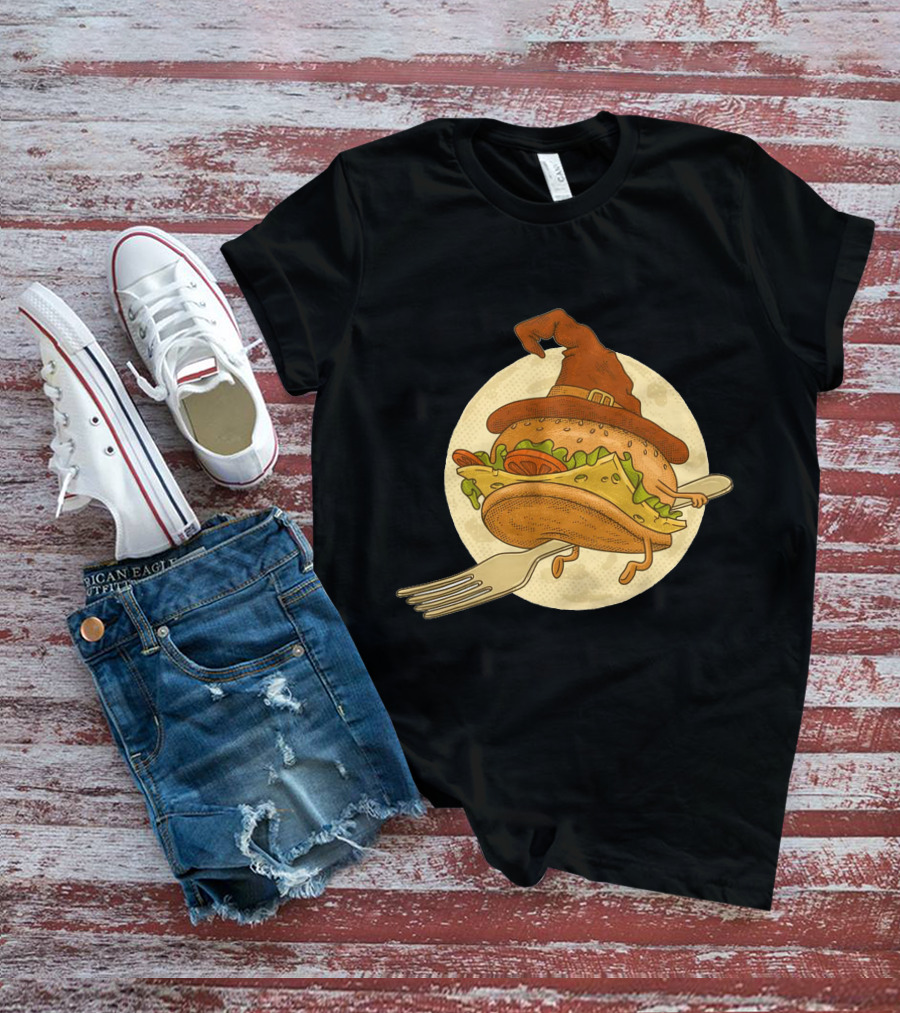 Hamburger With Witch Hat Riding A Fork In Front Of Full Moon T-Shirt