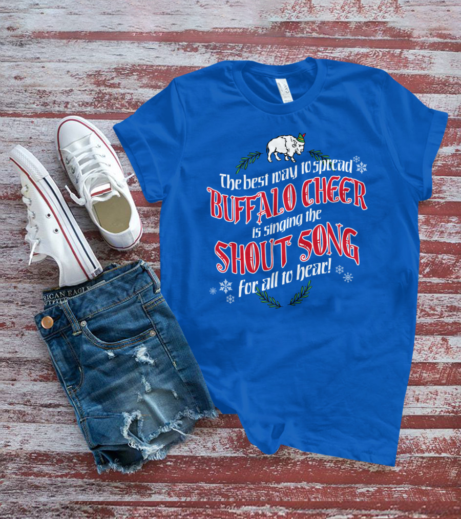 The Buffalo Cheer with Shout Song Festive Buffalo Snowflakes Shirt offers a regular fit. Made from 100% ring-spun cotton that is pre-shrunk to help maintain size and shape after washing. Features reinforced construction details for durability. Available in U.S. standard sizes S-5XL to accommodate various body types.