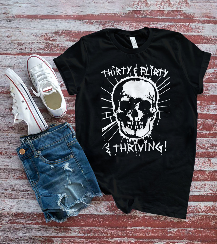 The Thirty Flirty and Thriving Skull Shirt offers a regular fit. Made from 100% ring-spun cotton that is pre-shrunk to help maintain size and shape after washing. Features reinforced construction details for durability. Available in U.S. standard sizes S-5XL to accommodate various body types.