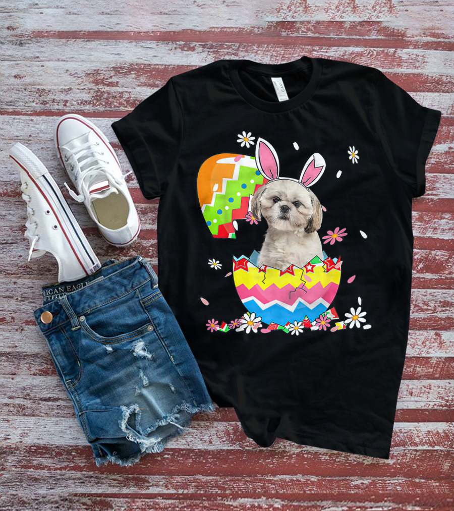 Shih Tzu Dog In Colorful Easter Egg With Bunny Ears And Flowers T-Shirt
