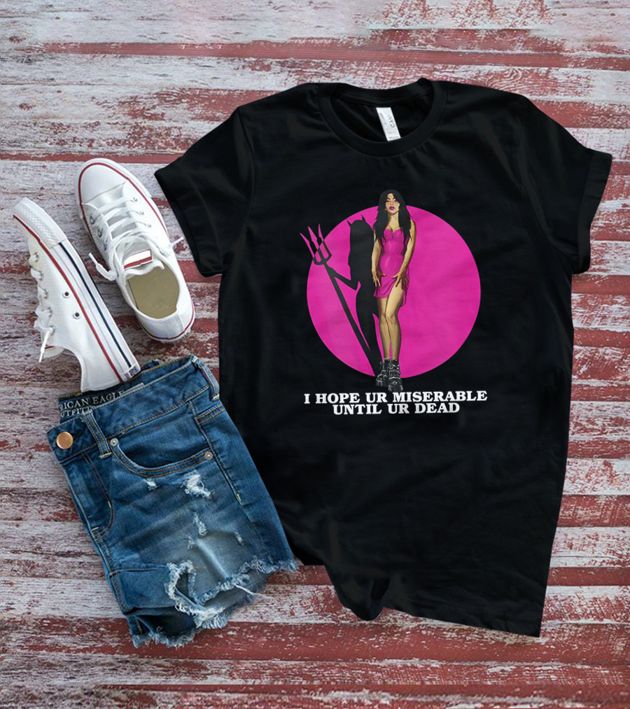 The I Hope Ur Miserable Until Ur Dead Pink Devil Woman Shirt offers a regular fit. Made from 100% ring-spun cotton that is pre-shrunk to help maintain size and shape after washing. Features reinforced construction details for durability. Available in U.S. standard sizes S-5XL to accommodate various body types.