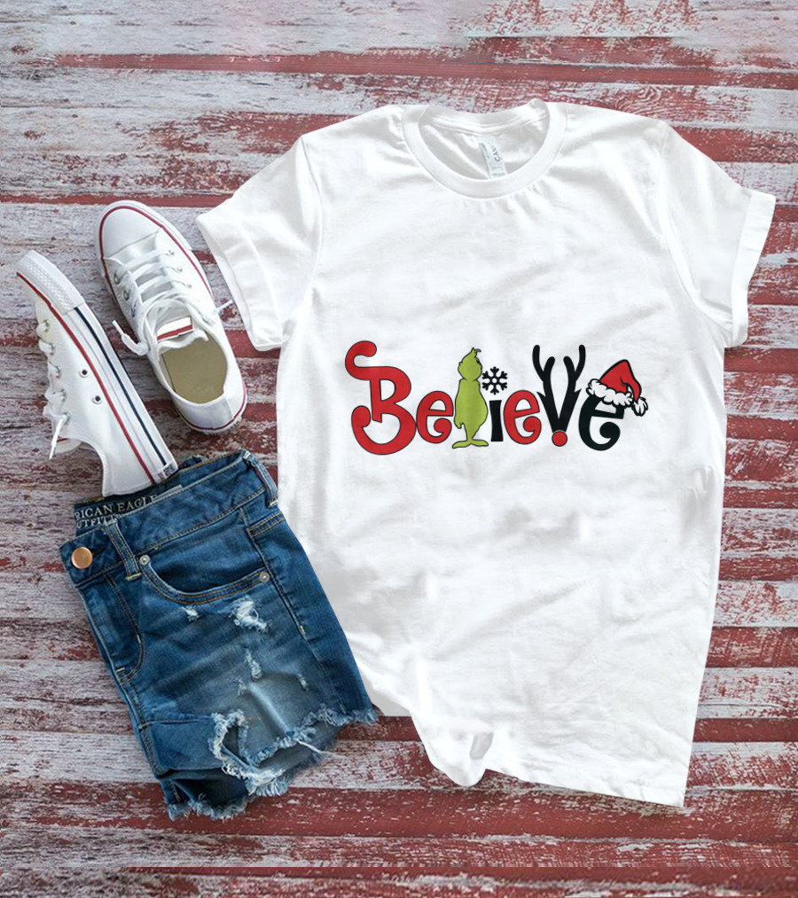 Grinch Believe Christmas Santa Hat Antlers T-Shirt