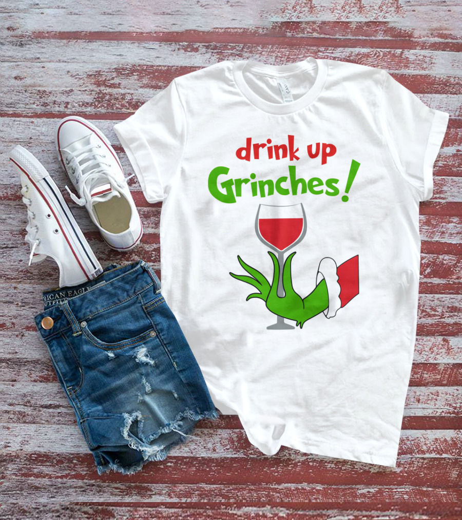 Drink Up Grinches Christmas Wine Glass Green Hand Santa Sleeve T-Shirt