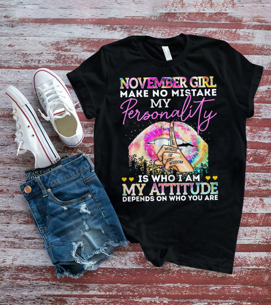 November Girl Make No Mistake My Personality Is Who I Am My Attitude Depends On Who You Are Whisper Words Of Wisdom T-Shirt