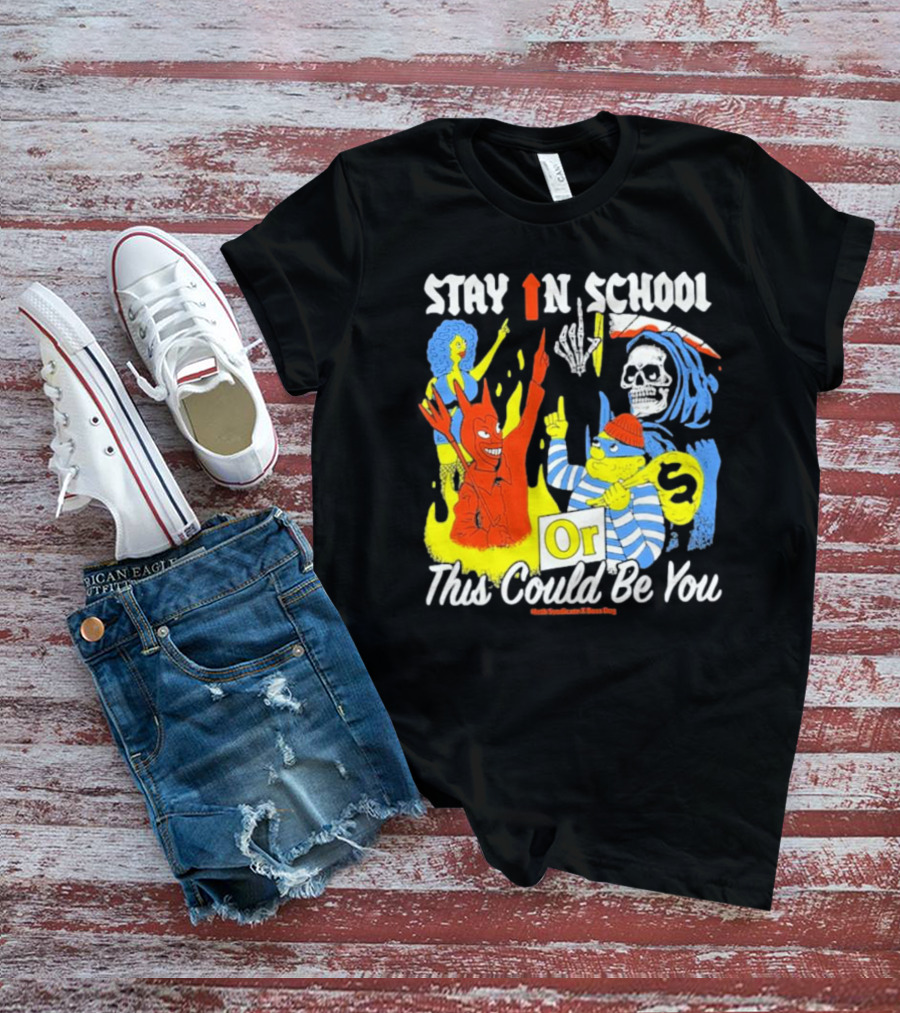 The Stay In School Or This Could Be You Red Devil Skeleton Bart Simpson Style Mark Gonzales x Deaton Chris Anthony Shirt offers a regular fit. Made from 100% ring-spun cotton that is pre-shrunk to help maintain size and shape after washing. Features reinforced construction details for durability. Available in U.S. standard sizes S-5XL to accommodate various body types.