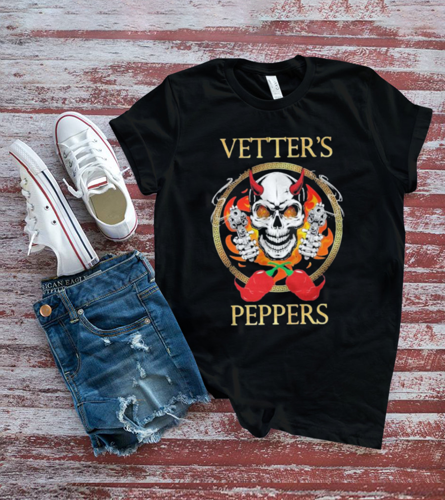 Vetter’s Peppers Skull With Red Horns And Dual Pistols Surrounded By Flames And Chili Peppers T-Shirt