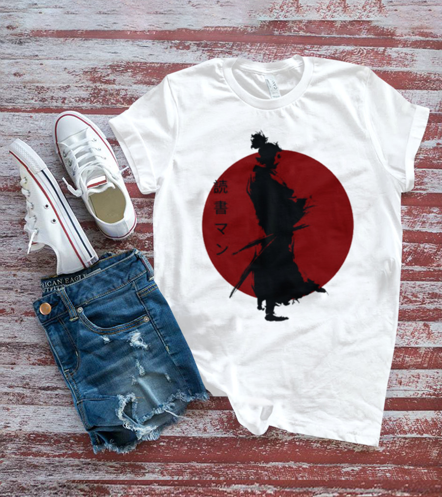 Miyamoto Musashi Samurai Silhouette Red Sun Kanji Reading Man T-Shirt