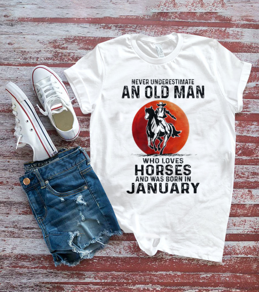 Never Underestimate An Old Man Who Loves Horses Born In January Riding A Horse Against A Red Moon T-Shirt
