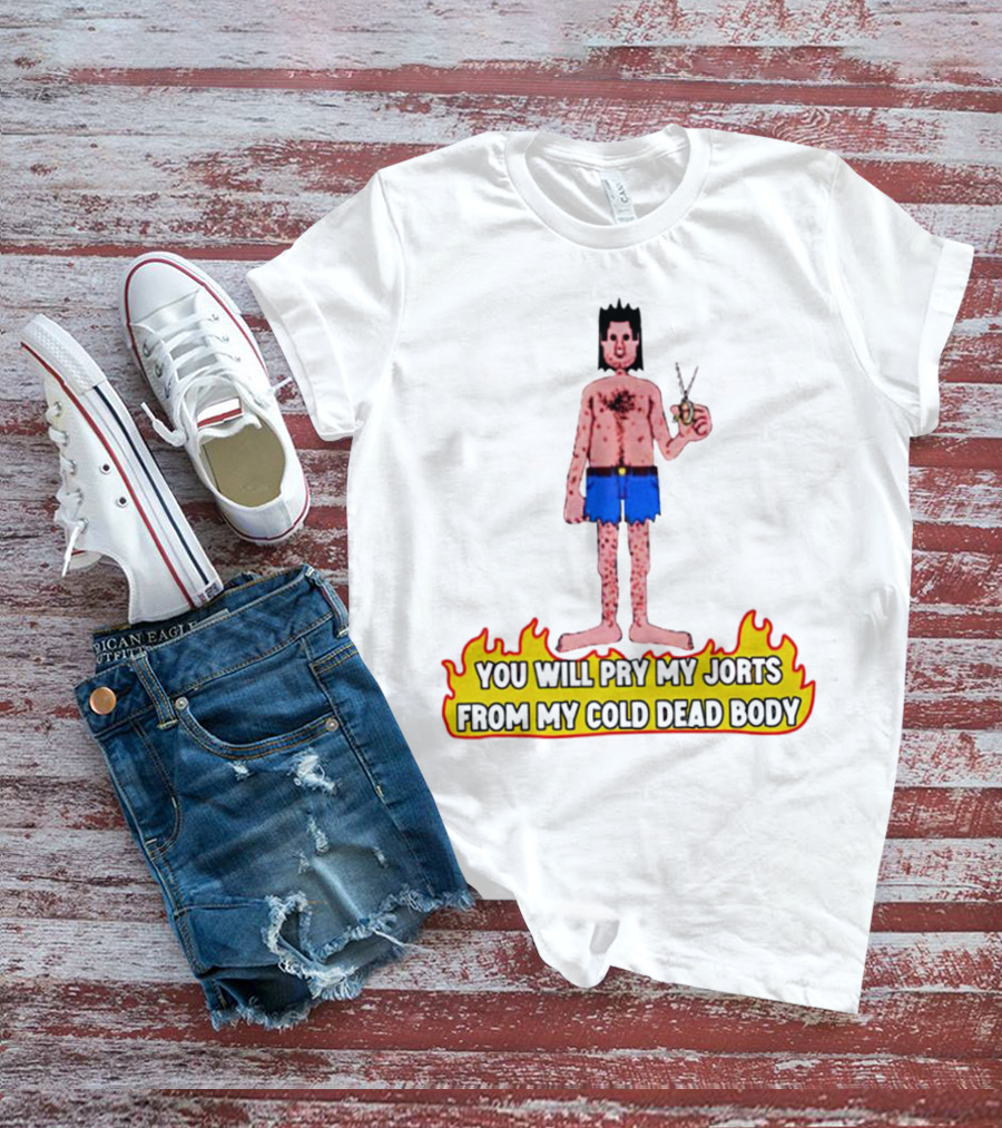 You Will Pry My Jorts From My Cold Dead Body Cartoon Character Holding Scissors In Flames T-Shirt