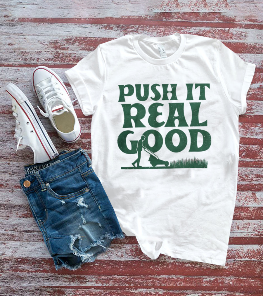The Push It Real Good Lawn Mower Humor Shirt offers a regular fit. Made from 100% ring-spun cotton that is pre-shrunk to help maintain size and shape after washing. Features reinforced construction details for durability. Available in U.S. standard sizes S-5XL to accommodate various body types.