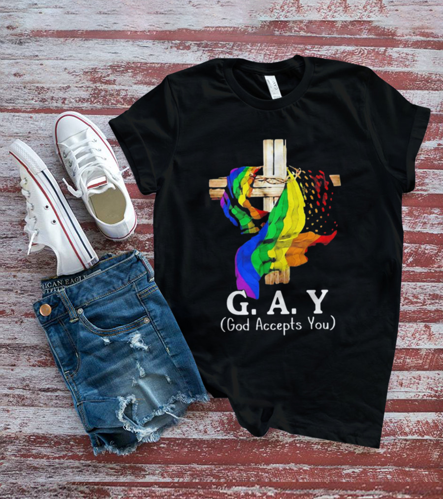GAY Pride Cross God Accepts You Rainbow Flag T-Shirt