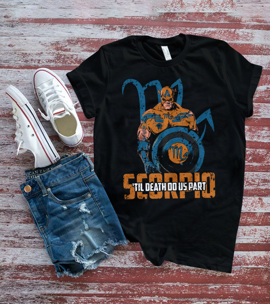 The Captain America Scorpio Zodiac Hero 'Til Death Do Us Part Marvel Fans Shirt offers a regular fit. Made from 100% ring-spun cotton that is pre-shrunk to help maintain size and shape after washing. Features reinforced construction details for durability. Available in U.S. standard sizes S-5XL to accommodate various body types.