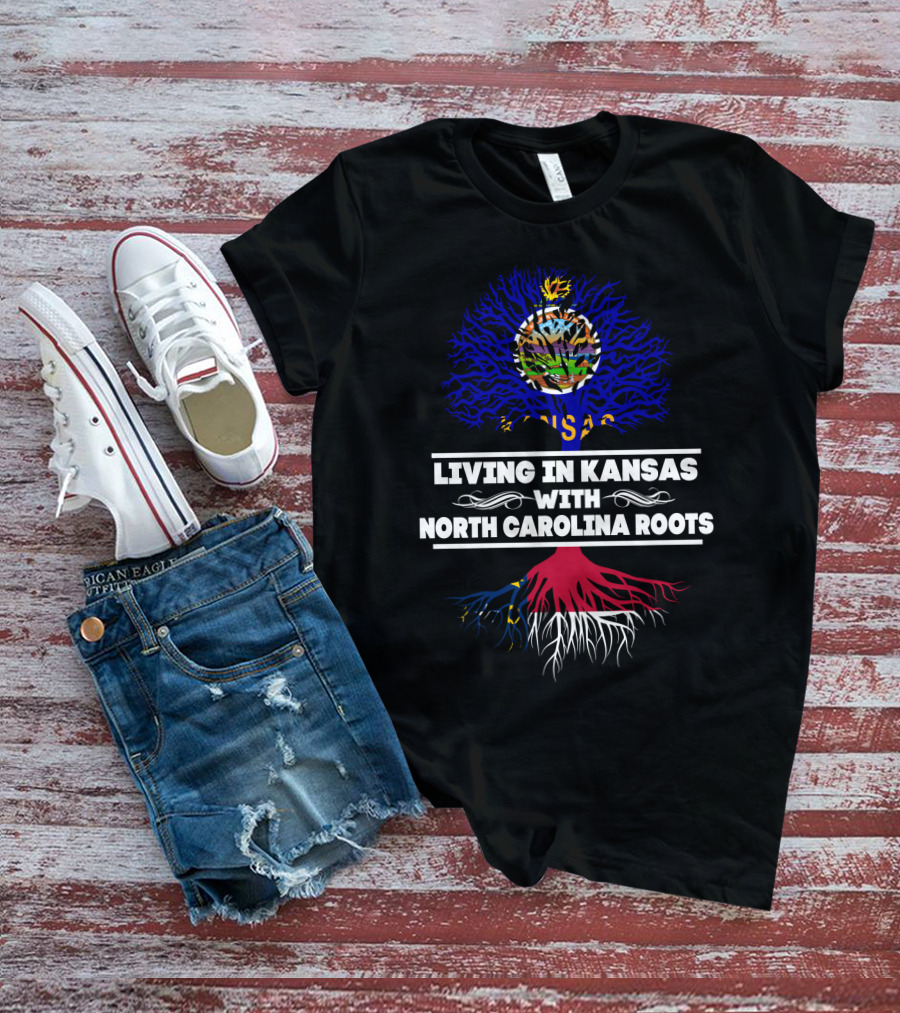Kansas Living Embraced By North Carolina Roots With State Flag Tree T-Shirt