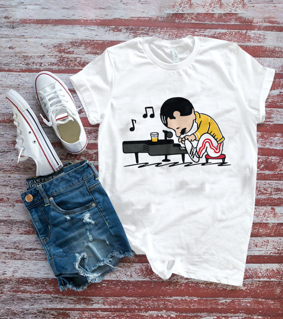 Freddie Mercury Cartoon At Piano With Music Notes And Beer Glass T-Shirt