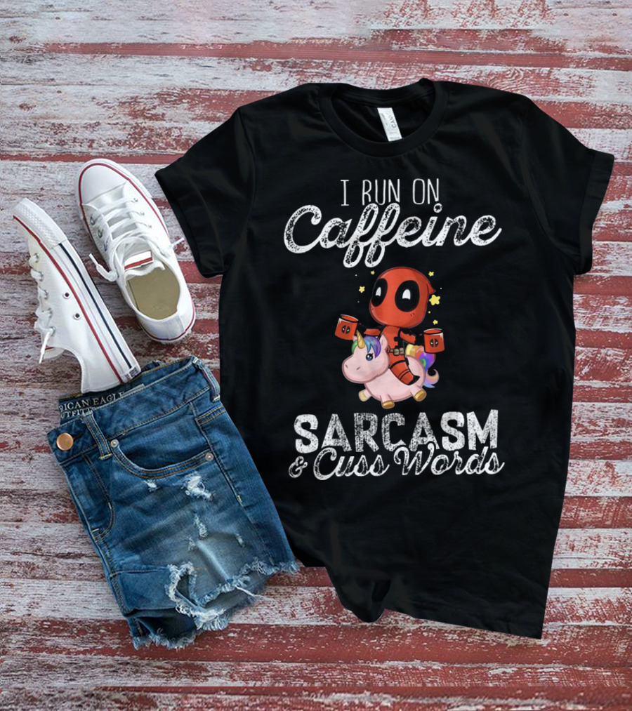 Deadpool Riding Unicorn I Run On Caffeine Sarcasm Cuss Words T-Shirt