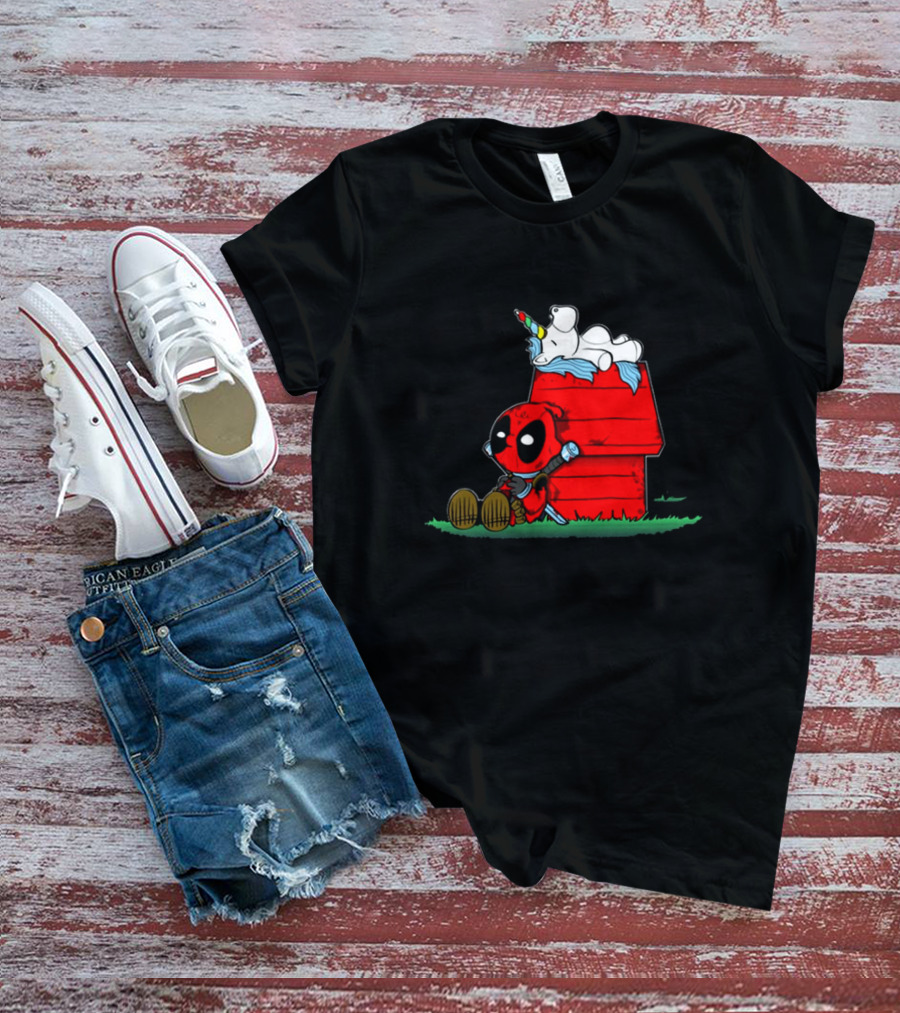 Deadpool And Snoopy Unicorn Crossover On Doghouse With Red And Black Accents T-Shirt