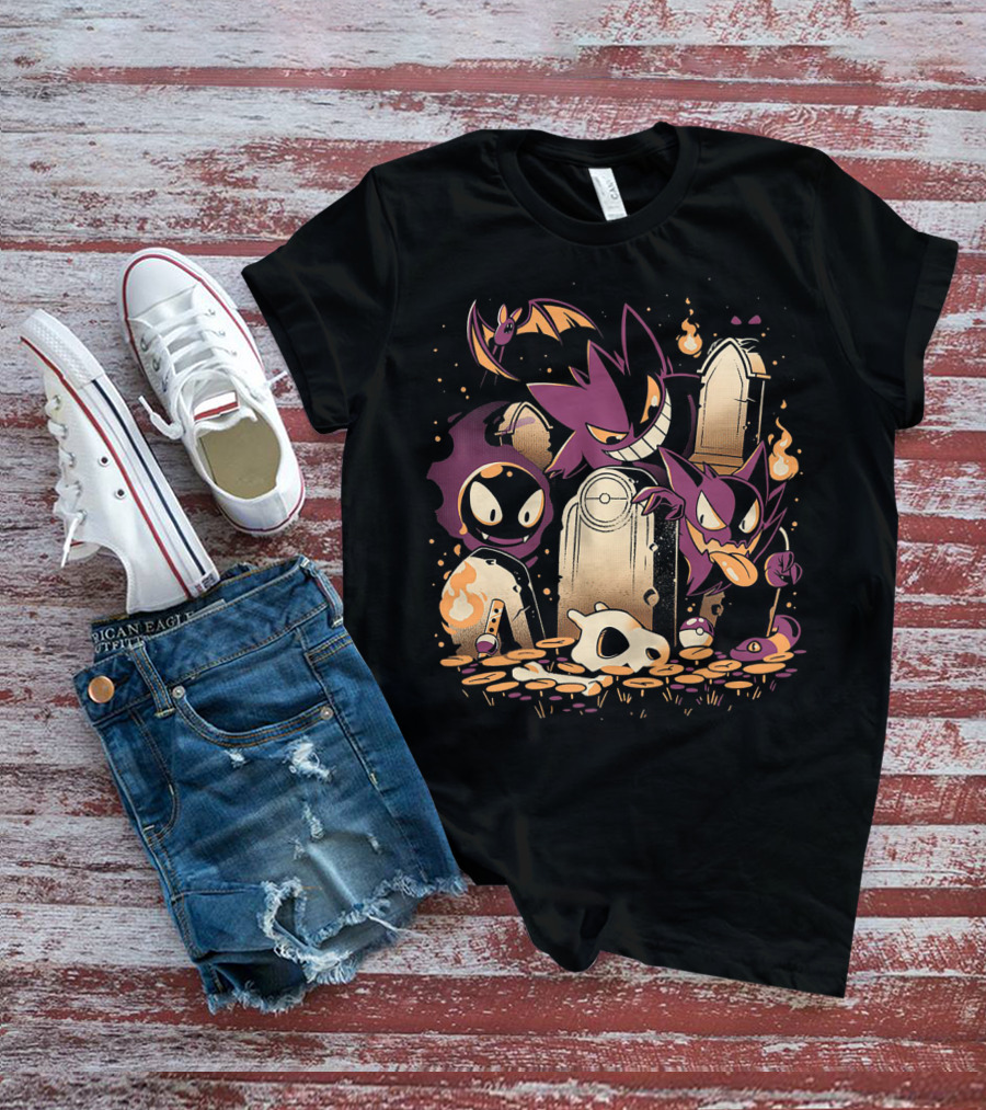 Pokemon Gastly Haunter Gengar Spooky Graveyard Scene With Fire And Skull T-Shirt