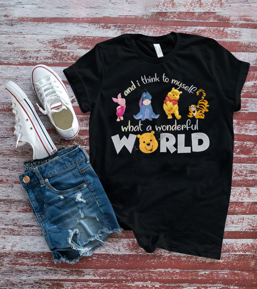 The Winnie The Pooh Eeyore Tigger Piglet And I Think to Myself What a Wonderful World Shirt offers a regular fit. Made from 100% ring-spun cotton that is pre-shrunk to help maintain size and shape after washing. Features reinforced construction details for durability. Available in U.S. standard sizes S-5XL to accommodate various body types.