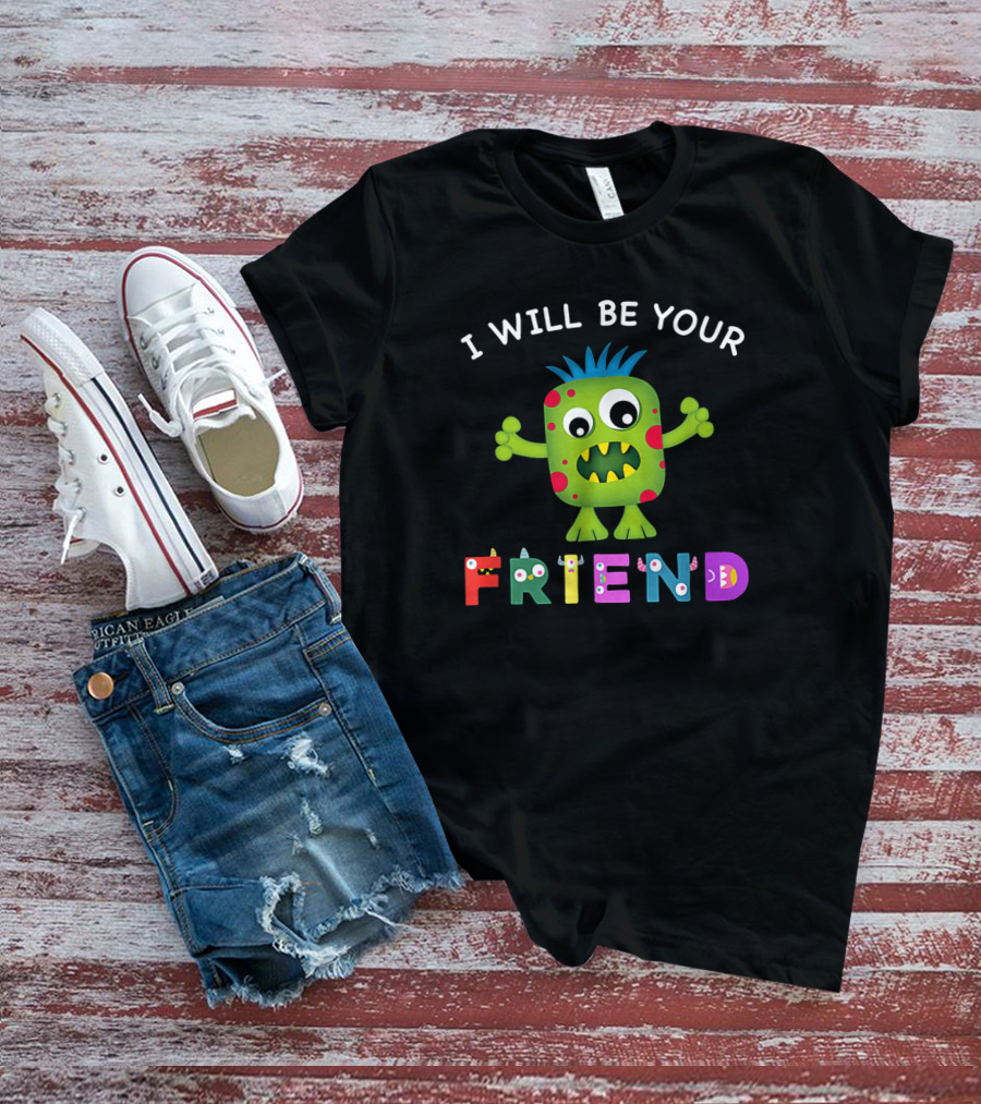 The Friendly Monster With Colorful Letters I Will Be Your Friend Shirt offers a regular fit. Made from 100% ring-spun cotton that is pre-shrunk to help maintain size and shape after washing. Features reinforced construction details for durability. Available in U.S. standard sizes S-5XL to accommodate various body types.