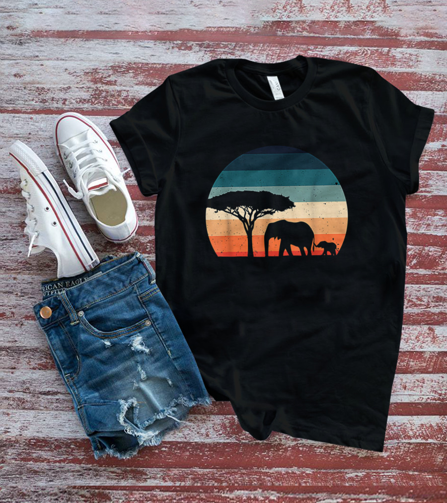 The Elephant and Acacia Tree Silhouette Against Striped Vintage Sunset Shirt offers a regular fit. Made from 100% ring-spun cotton that is pre-shrunk to help maintain size and shape after washing. Features reinforced construction details for durability. Available in U.S. standard sizes S-5XL to accommodate various body types.