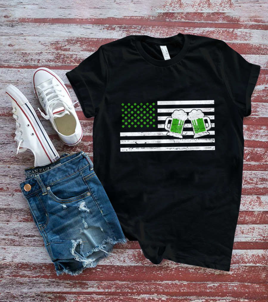 Happy Patrick's Day American Flag With Green Shamrocks And Beer Mugs T-Shirt