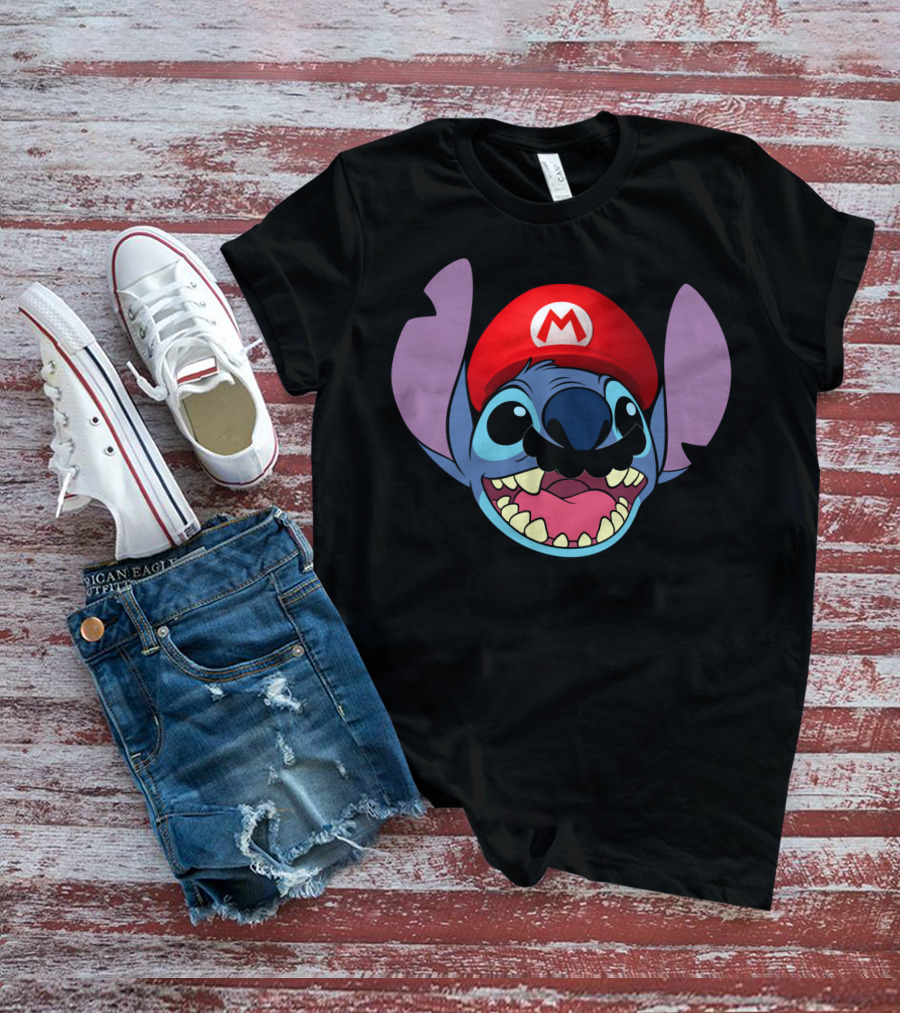 Stitch Wearing Mario Hat And Mustache Cartoon Crossover T-Shirt