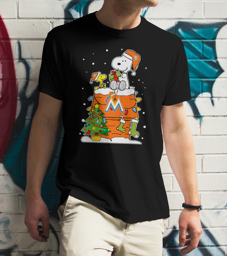 Miami Marlins Snoopy Christmas Holiday Scene With Gifts And Tree T-Shirt