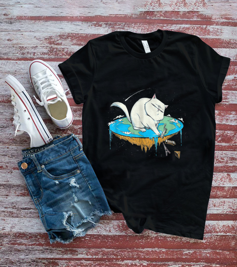 Cat Pawing Flat Earth With Iconic Landmarks For Humorous Cat Lovers T-Shirt