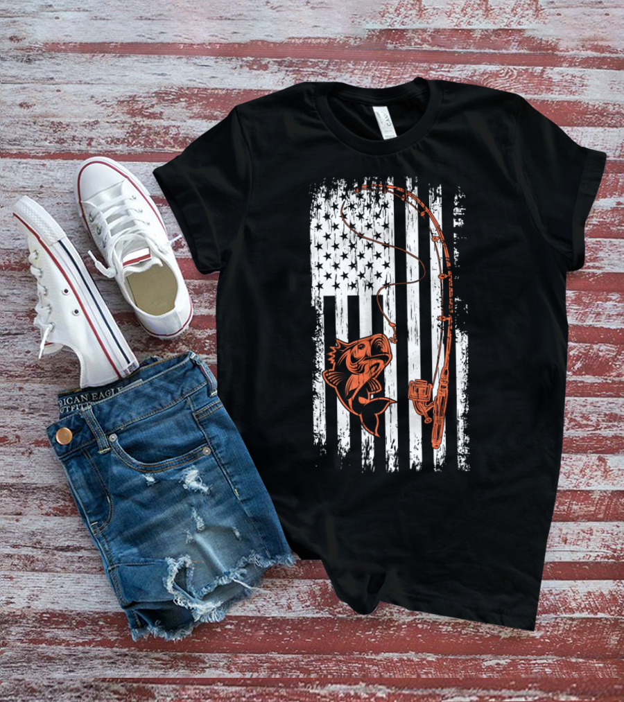USA Fishing Flag Bass And Rod American Flag T-Shirt