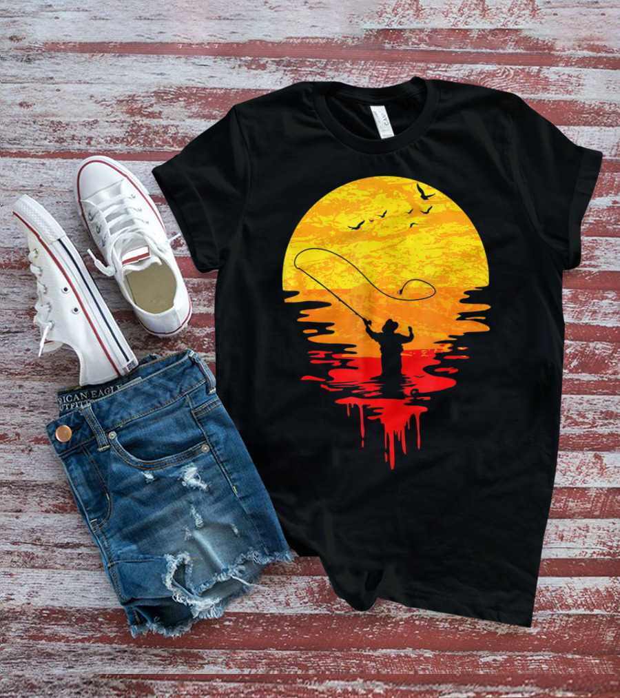 The Fly Fishing at Sunset Vintage Style Silhouette with Birds Shirt offers a regular fit. Made from 100% ring-spun cotton that is pre-shrunk to help maintain size and shape after washing. Features reinforced construction details for durability. Available in U.S. standard sizes S-5XL to accommodate various body types.