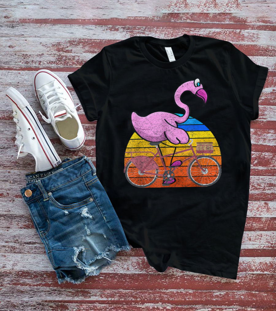 Flamingo Riding Bicycle Funny Retro Sunset T-Shirt