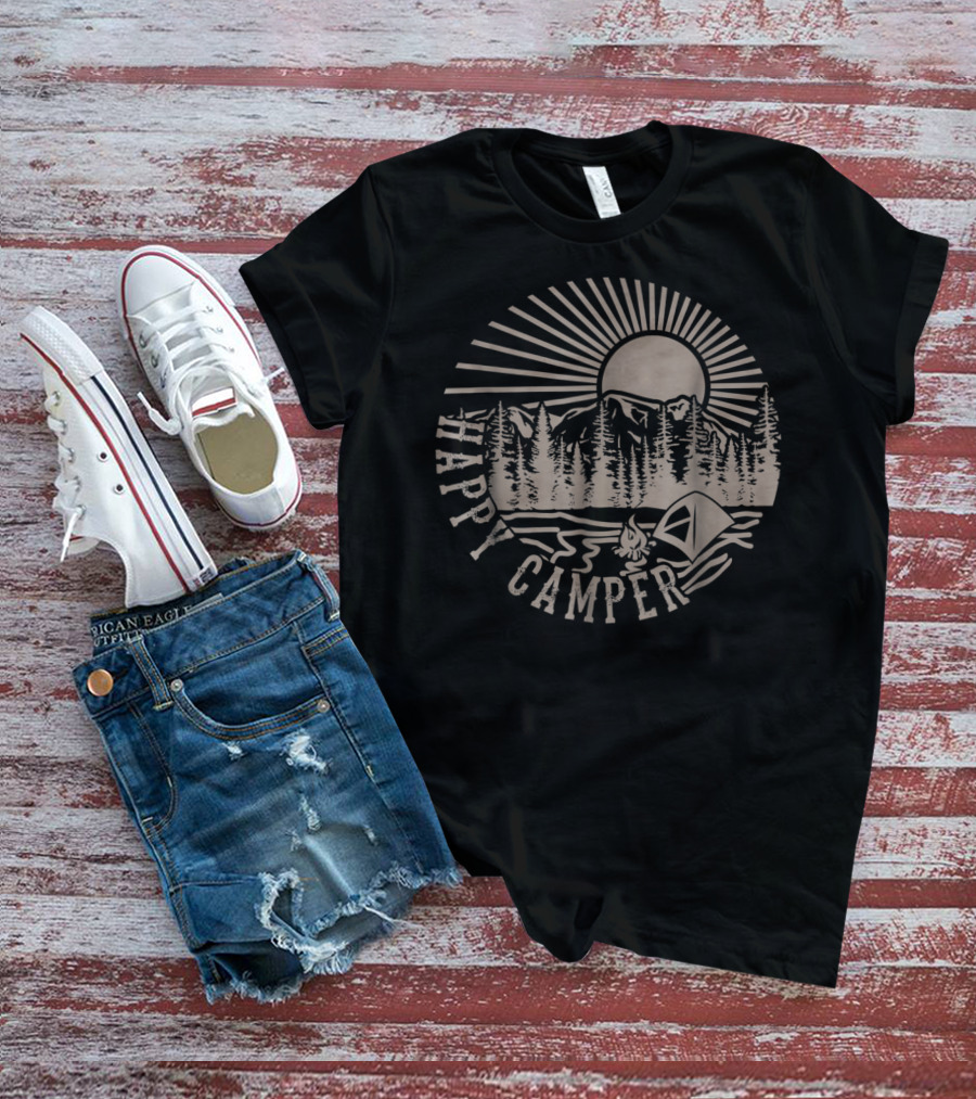Happy Camper With Tent, Trees, Mountains, And Sunburst T-Shirt