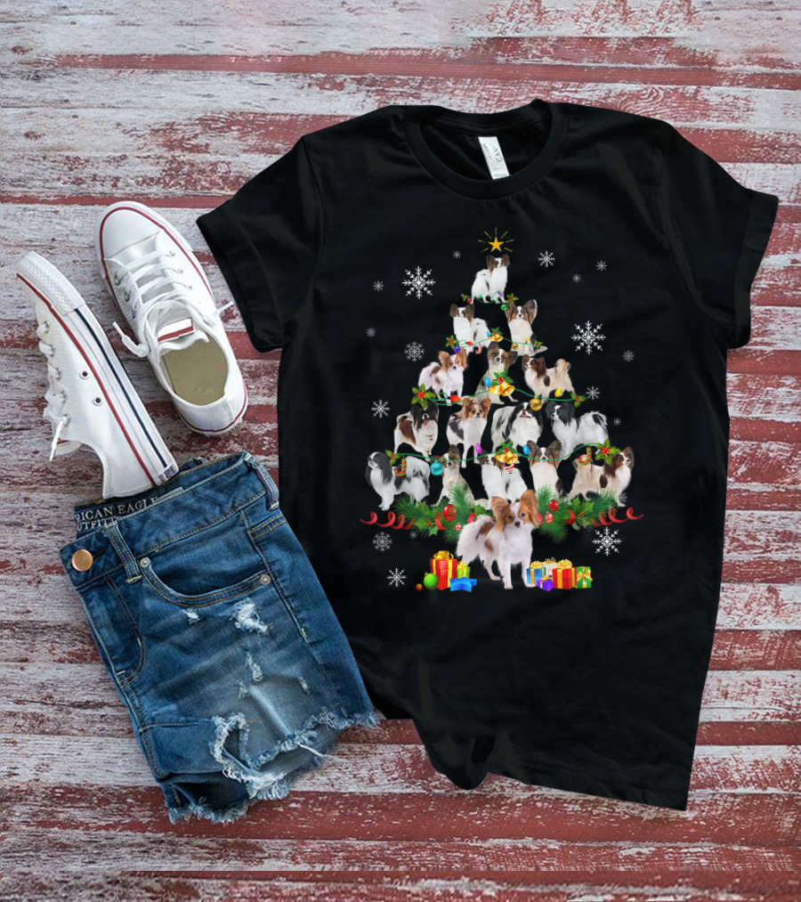 Papillon Dog Christmas Tree Lights With Snowflakes And Presents T-Shirt