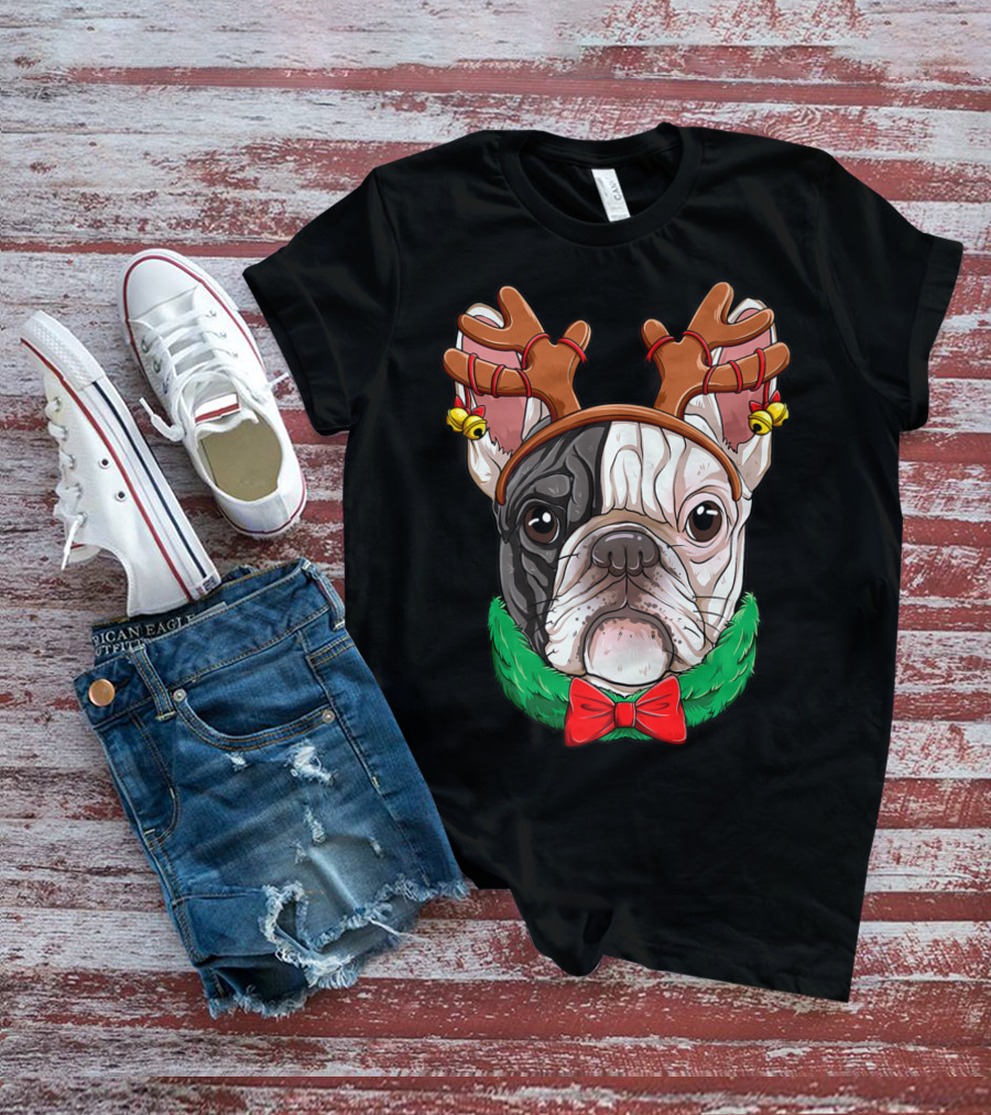 French Bulldog With Christmas Reindeer Antlers And Bow Tie T-Shirt