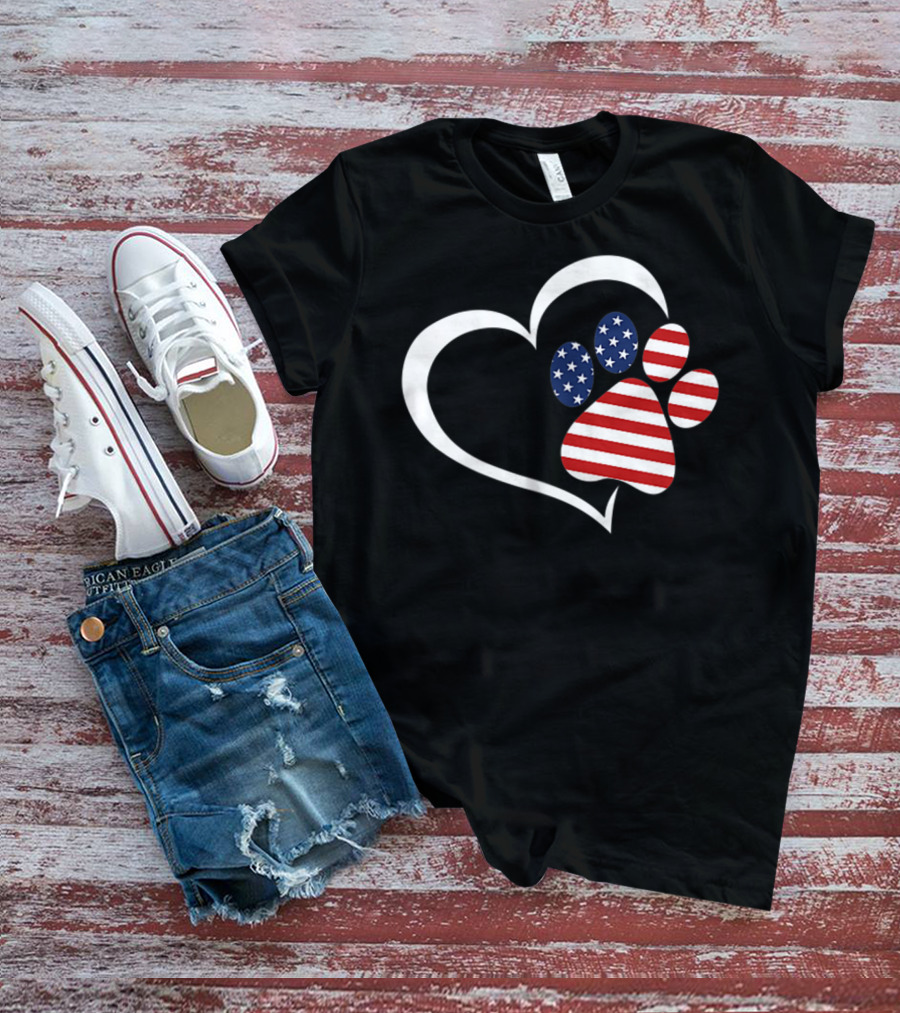 Dog Paw Heart Love Red White Blue American Flag Patriotic T-Shirt
